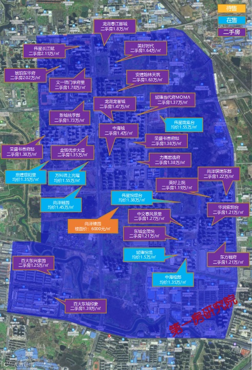从整个板块市场来看,入驻万科、中海、华润、中交、伟星等大型品牌房企,板块房源品质来说还是有保障的。前期项目基本售完,目前在售7个项目,待售1个项目。新房与二手房价格存在一定差价,在售新房都是肥东产权项目,价格在1.3-1.5万/㎡,二手房瑶海均价1.6-2.1万/㎡,而肥东二手房均价多在1.2-1.3万/㎡。板块内的次新房较多,同时价格上有优势,不利于新房的去化。