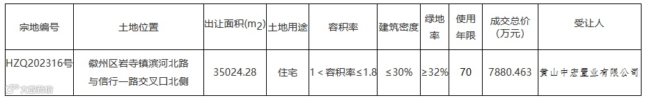 黄山中宏置业竞得黄山1宗住宅用地,成交价7880.463万元