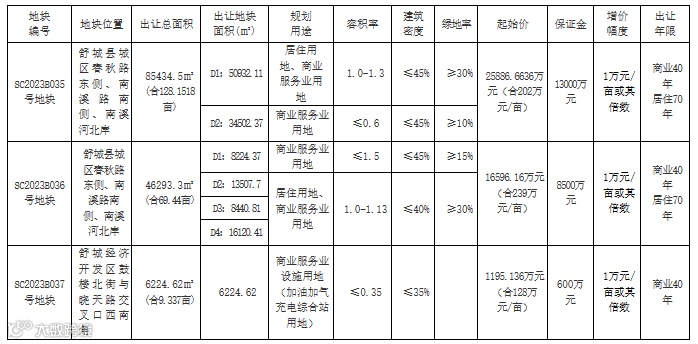 8.各地块竞得人自成交之日起一个月内付清全部成交款的50%, SC2023B(035、036)号地块一年内付清全部成交款,SC2023B037号地块六个月内付清全部成交款。未按期交纳成交款的,自滞纳之日起,每日按迟延支付款项的1‰向出让人缴纳违约金,交款延期不得超过两个月,延期期满后仍不交清成交款的,出让人有权解除出让合同,定金(总成交款的20%)不予返还;SC2023B(035、036)号地块自成交之日内起1个月内,由舒城县城关镇人民政府负责按宗地平面界址图及地形现状交付土地,SC2023B037号地块自成交之日内起1个月内由舒城经济开发区管委负责按宗地平面界址图及地形现状交付。各地块自成交之日起六个月内动工建设, SC2023B(035、036)号地块建设周期不超过两年,SC2023B037号地块建设周期不超过一年。
