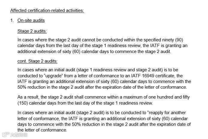 如果进行初次审核(第二阶段审核)是为了“重新申请一份符合性认证书,以便在符合性认证书有效期届满后的第二阶段审核中开始减少50%;IATF准许额外延长六十(60)个日历日。