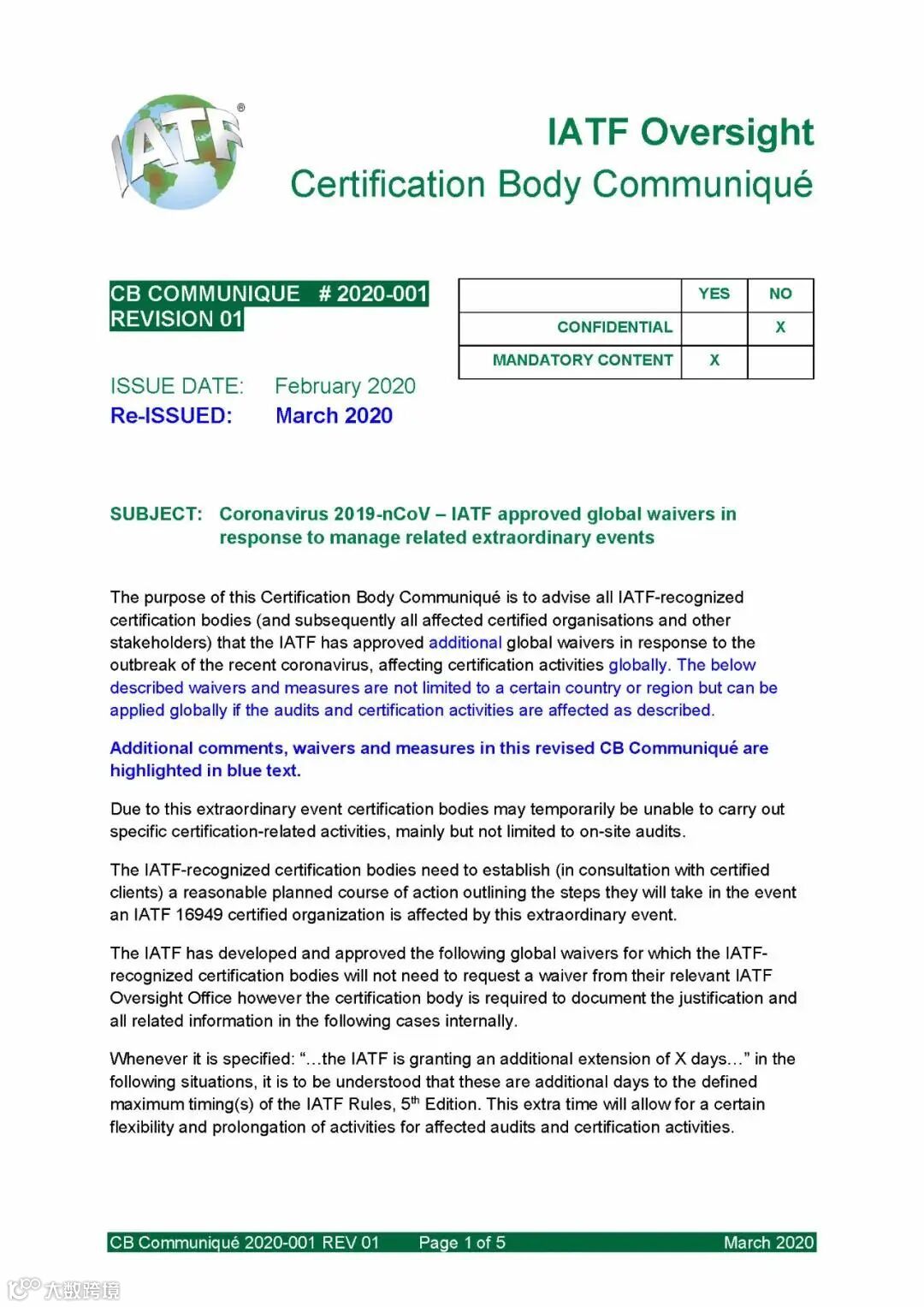 2月5日IATF发布了对中国的豁免决定,3月13日,全球豁免公告升级,详情内容见下方。