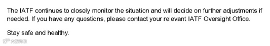 IATF继续密切监视局势,并将在需要时决定进一步调整。如有任何疑问,请联系相关的IATF监督办公室。