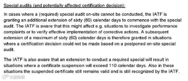 *如果无法进行(要求的)现场特殊审核,IATF将批准额外延长60天,以开始特殊审核。IATF 意识到,这可能会影响到调查绩效投诉或验证纠正措施的有效实施。因此,如果无法根据推迟的现场特殊审核(及时)作出认证决定,则最多可延长60天。