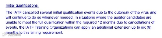 IATF由于病毒的爆发取消了几项初始资格审查活动,并将在需要时继续这样做。如果由于事件的取消而导致审核员候选人无法在要求的12个月内达到完全资格,则IATF培训组织可以为此时限要求再延长六(6)个月。