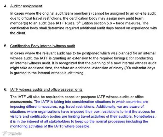 5.(认证机构)如果内部见证审核的计划已推迟,IATF将延长进行内部见证审核所需的时间。我们认识到,策划新的内部见证审核可能需要更多的时间,因此,内部见证审核的时间可额外延长90天。