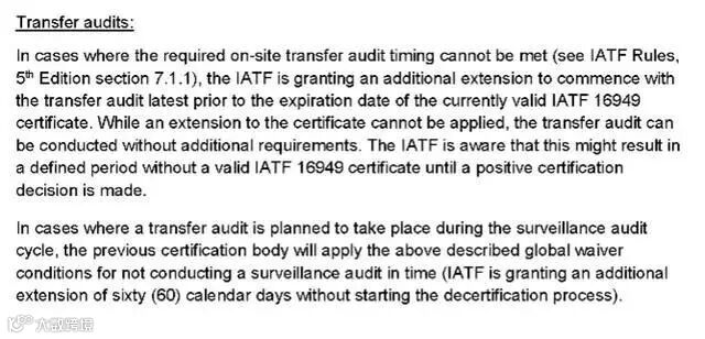如果计划在监督审计周期内进行转移审核,则先前的认证机构将适用上述全球豁免条件(IATF在不启动认证退出程序的情况下,再延长60天),而无法及时进行监督审核。