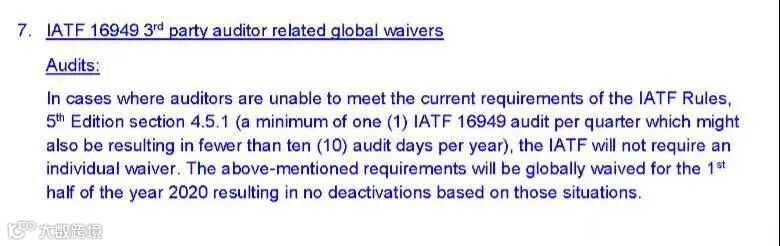 7.IATF16949第三方审核员相关全球豁免审核:如果审核员无法满足当前IATF规则第5版第4.5.1节(每季度至少一(1)IATF 16949审核,这也可能导致每审核年度少于十(10)审核日)的要求, IATF将不需要个人豁免。2020年上半年,上述要求将在全球范围内免除,因此不会因这些情况而导致(审核员资格)停用。