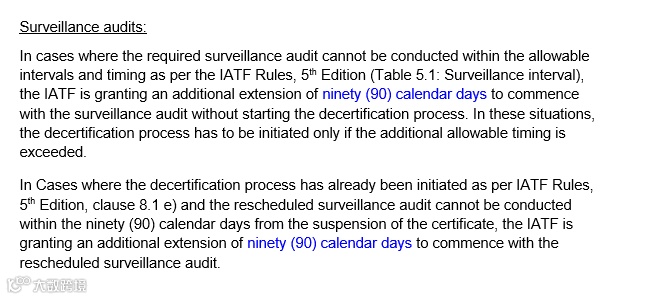 如果所需的监督审核不能按照IATF 规则第5版(表5.1: 监督间隔)的允许间隔和时间进行,IATF准许再延长九十(90)个日历日,以便在不启动取消认证程序的情况下开始监督审核。在这些情况下,只有超过了额外允许的时间,才必须启动退出过程。