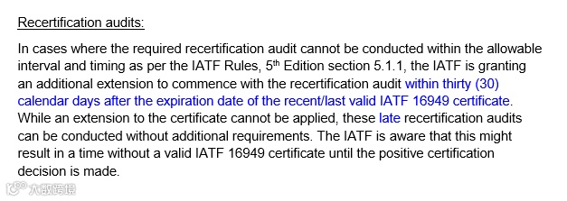 如果无法按照IATF规则第5版第5.1.1节的规定,在允许的时间间隔和时间范围内进行所需的再认证审核,则IATF会授予额外的延期,以在最近/最后有效的IATF16949证书到期日后三十(30)个日历日内开始再认证审核。虽然证书无法延期,但可以在没有其他要求的情况下进行较晚的再认证审核。IATF意识到,在做出肯定的认证决定之前,这可能会导致(认证客户)一段时间没有有效的IATF 16949证书。