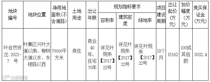六、出让文件获取。本次挂牌出让地块的详细资料和具体要求详见挂牌出让文件。(挂牌出让文件见六安市叶集区公共资源交易电子