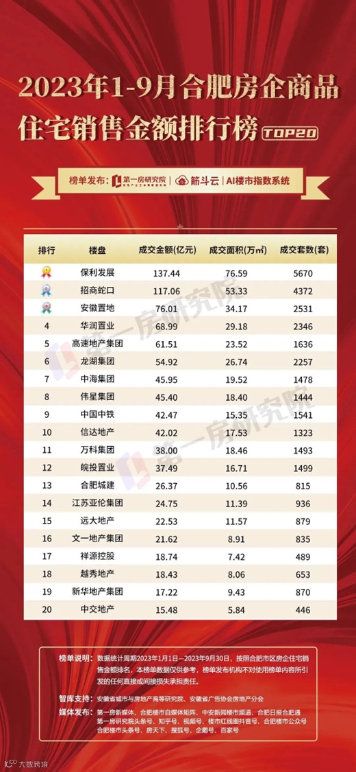 根据AI楼市大数据监测显示,2023年前三季度合肥TOP20房企累计销售932.4亿元,销售面积422.7㎡。国央企占12席,民营企业占8席,其中,安徽本土房企占8席。保利发展以销售金额137.44亿元,销售面积76.59万㎡,销售套数5670套的成为位列销售榜首位。业绩主要贡献项目是保利和光熙悦、保利珺悦和保利招商臻悦。