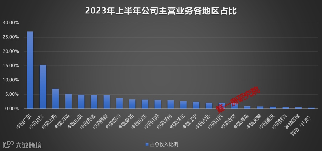 保利发展的业务分布广泛,是一家以不动产投资开发为主、围绕美好生活服务和产业金融服务开展相关业务布局的大型、综合性企业集团,业务范围涵盖房地产开发与销售、物业服务、全域化管理、销售代理、商业管理、不动产金融等。分产品来看,2023年上半年公司主营业务中,房地产销售收入收入1255.28亿元,同比增长25.33%,占营业收入的91.61%。分区域来看,广东、浙江和上海占据前三名。