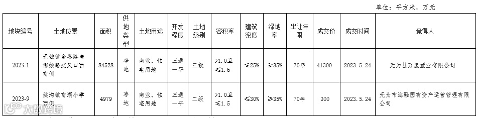 无为县万厦置业、无为市海融国有资产运营管理分别拿下无为市各1宗商住用地,总成交价4.16亿!