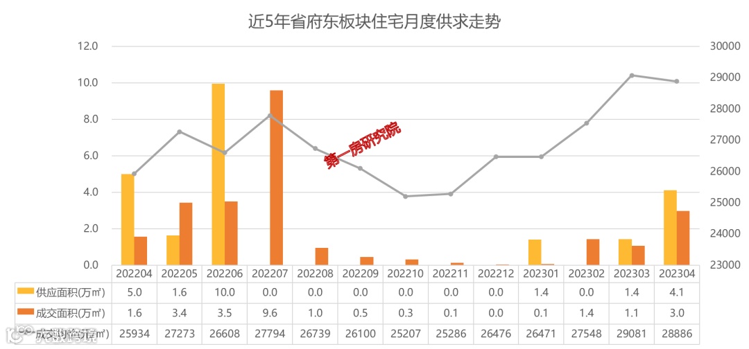 省府东片区近几年发展迅速,市场热度也逐步兴起。近5年片区年均供应16.4万㎡,年均成交17.7万㎡,供不应求,而成交均价大幅攀升。而从近一年的月度走势来看,虽然受限于项目较少的原因,成交量一直不高,但成交均价却是节节攀升。