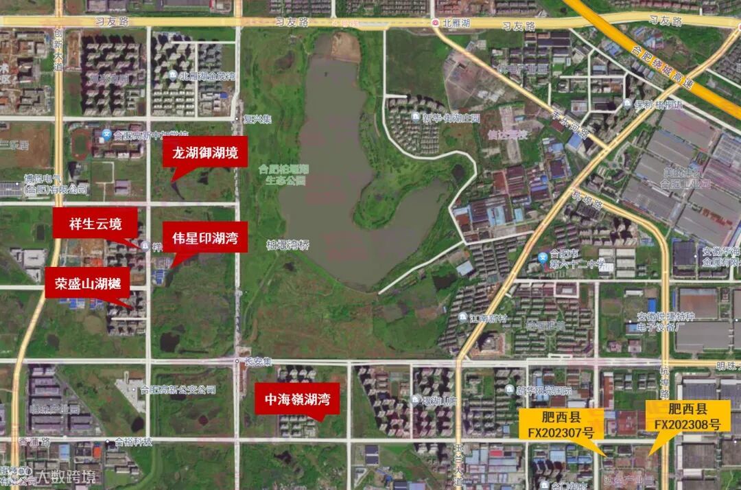 这两宗地块位于肥西泛北雁湖板块,西侧不远处为中海嶺湖湾,再往西北处则是龙湖御湖境、伟星印湖湾项目。