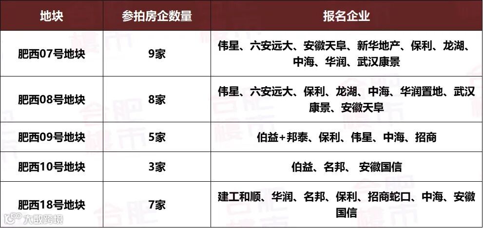 5、肥西18号地块:截至目前,已有建工和顺、华润、保利、招商等7家房企参与竞拍。