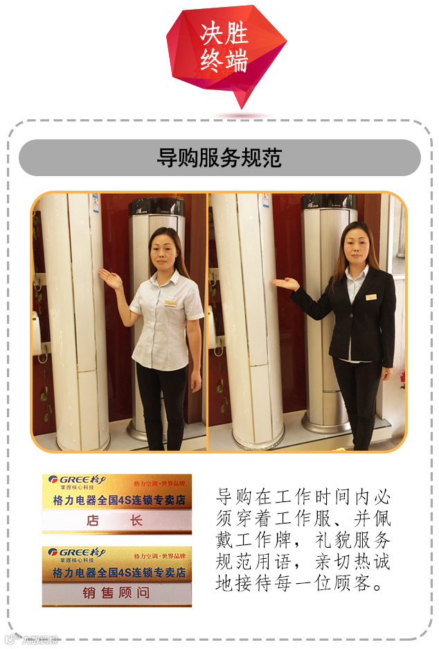 终端形象是格力品牌的重要组成部分,各专卖店要高度重视终端形象的建设和维护,在终端营造舒适、饱满、整洁的氛围,终端精彩由你创造!
