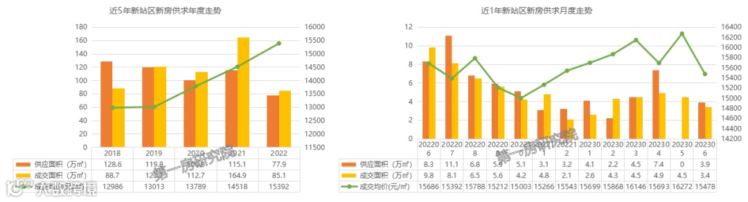 近5年新站区新房成交稳步上涨,2022年受大环境影响,成交量下滑明显,但成交均价大幅攀升达到15392元/㎡。今年新站区成交先扬后抑,主要是受新站取消限购影响,后面趋于理性,6月份销售3.4万㎡,均价15478元/㎡。