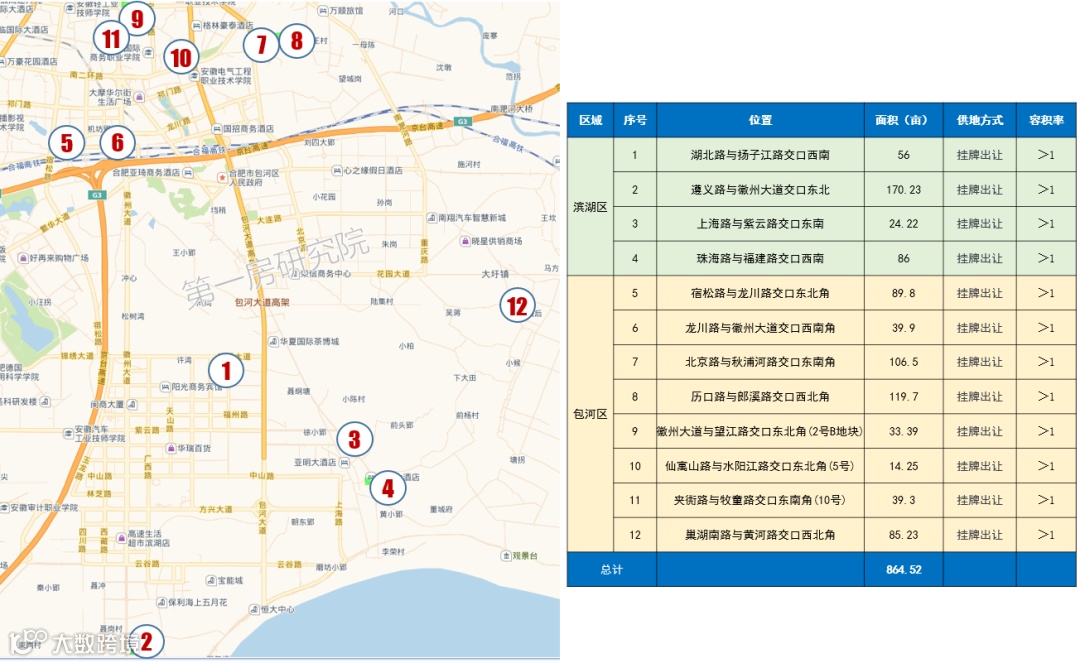 滨湖4宗(省府3宗,金融后台1宗)包河8宗(政务东2宗,老城3宗,淝河2宗,卓越城1宗);从地块位置来看,滨湖1/3号地位置较好,包河5/6号地位置较优,包河7/8号地所在区域存量较大,竞争较为激烈。