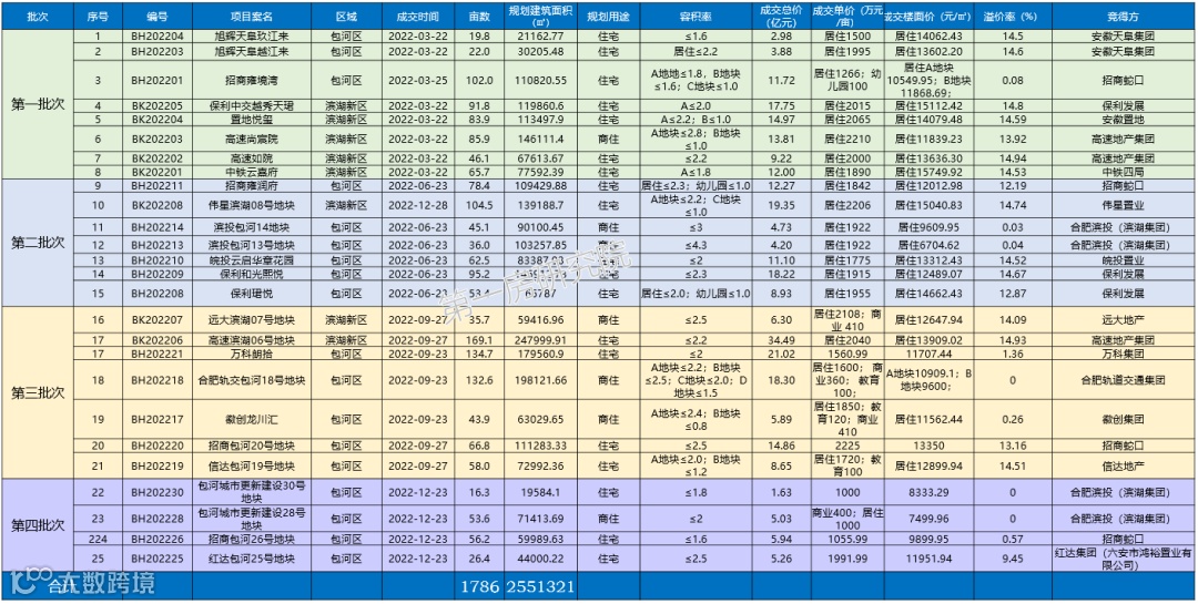 按批次成交情况来看,1-4批次成交率较高,其中1批次成交9宗,主力滨湖省府,2批次6宗,主力包河老城及淝河,3批次7宗,主力包河淝河,4批次5宗,主力包河淝河及政务东,共计成交1786亩。