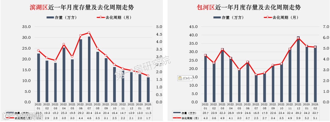 根据AI楼市大数据显示,滨湖区近一年显性存量逐月降低,截止至2023年2月底,显性存量11.5万㎡,按滚动12个月月均去化计算,去化周期1.7个月,存量低位;包河区近几月由于新开盘新加推项目集中入市,存量高企,截止至2023年2月底,显性存量33.7万㎡,按滚动12个月月均去化计算,去化周期5.1个月。
