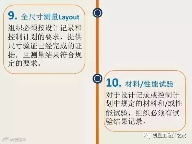 每一独立生产过程制造的零件,如相同的装配线和/或工作单元、多腔冲模、铸模、工装及仿形模的每一腔位的零件都必须进行测量,并对代表性的零件进行试验。