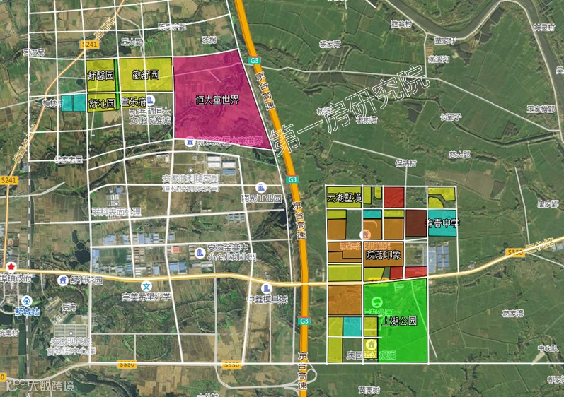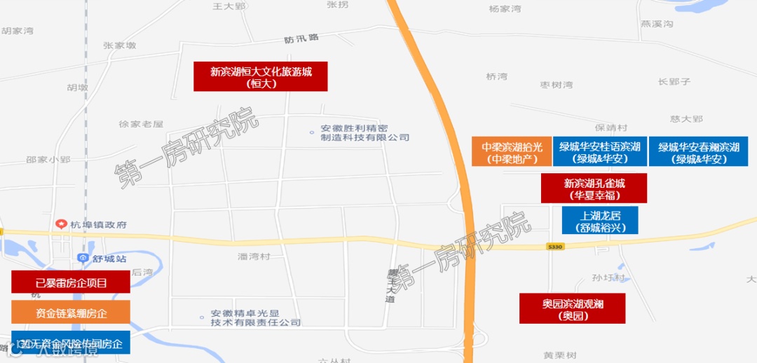 整个新滨湖大致可分为两个板块,恒大童世界板块和华夏幸福产业新城板块。目前恒大童世界板块仅有一个恒大一个项目。产业新城板块目前有华夏幸福、舒城裕兴、奥园、中梁、绿城、华安等多家房企已入驻,且品牌房企偏多。