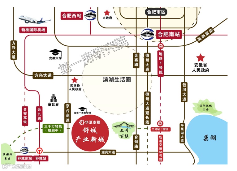 板块交通方面,目前高速公路有京台高速;快速路有合铜公路、徽州大道;轨道交通有规划三千万轻轨、规划地铁S4号线,板块规划交通条件比较优质。