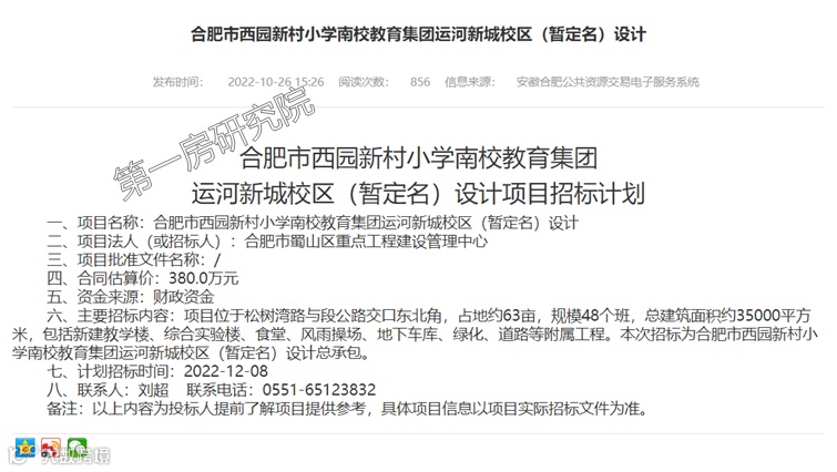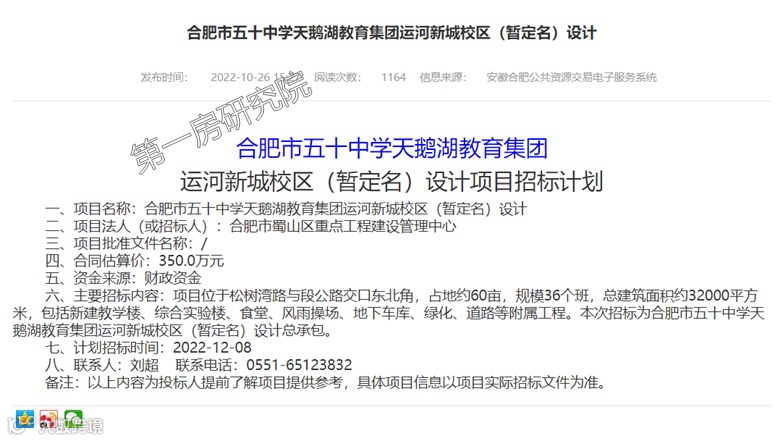 根据合肥公共资源交易中心的消息,五十中天鹅湖教育集团运河新城校区(暂定名)、西园新村小学南校教育集团运河新城校区(暂定名),计划12月8日启动招标。