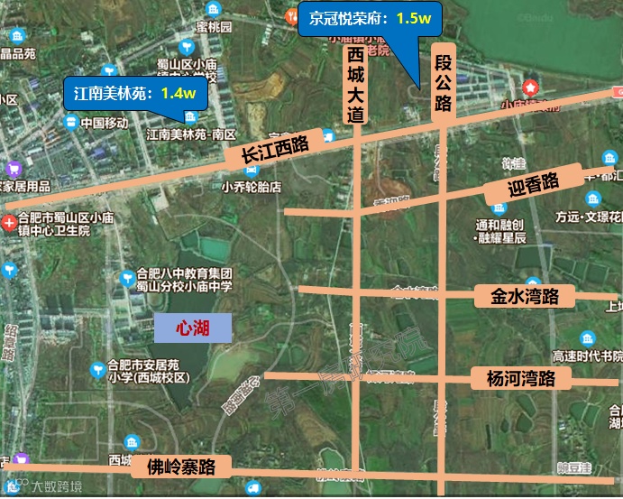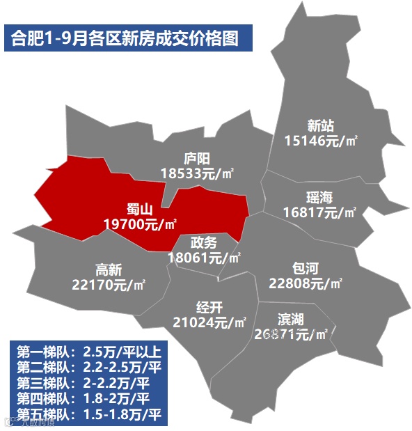 不过蜀山区1-9月新房成交均价1.97万/㎡,属于合肥九区第四梯队,主要是由于被小庙运河新城板块的项目价格所平均,导致整体蜀山均价被拉低。