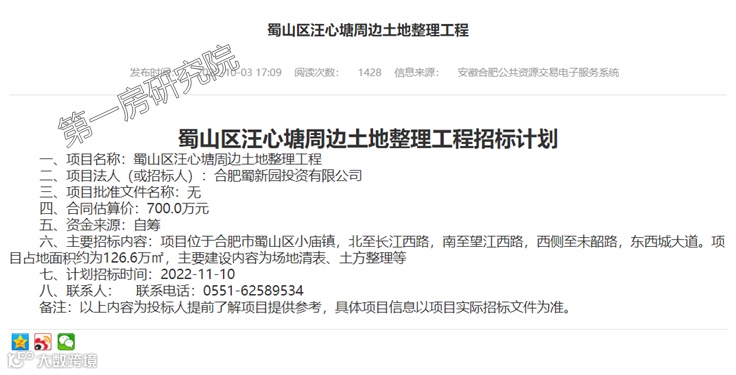 蜀山发布消息,汪心塘(即心湖公园片区)周边土地整理工程招标计划出炉,这标志着运河新城心湖片区建设即将正式启动。该项目位于运河新城片区,北至长江西路,南至望江西路,西侧至未韶路,东至西城大道,总占地面积约151平方公里,主要建设内容为场地清表、土方整理等,计划今年年底前完成,并同步进行片区内的征地工作。