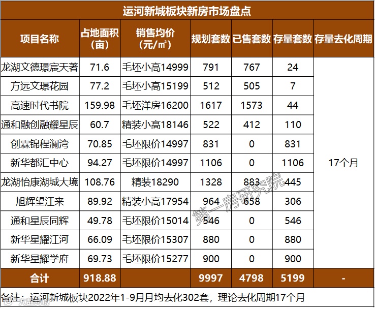 截止9月底,运河新城板块待售存量5199套,按2022年1-9月月均去化302套计算,理论去化周期17个月。但一个板块内11个项竞争激烈,市场成交量下滑导致库存下降缓慢,去化周期拉长,板块后劲不足。