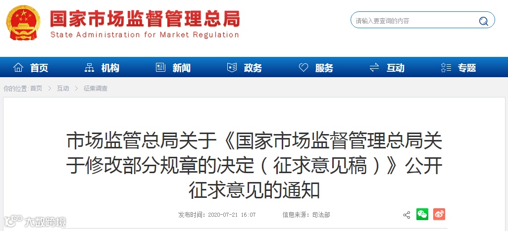 为进一步深化机构改革,优化营商环境,提升监管效能,市场监管总局起草了《国家市场监督管理总局关于修改部分规章的决定(征求意见稿)》,现向社会公开征求意见。欢迎有关单位和个人提出修改意见,并于2020年8月21日前反馈市场监管总局。公众可以通过以下途径和方式提出意见。