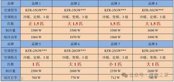 以上两种说法都有一定道理,而且结果相近,难以判断真伪。下表是市面上国内不同品牌空调的性能参数。