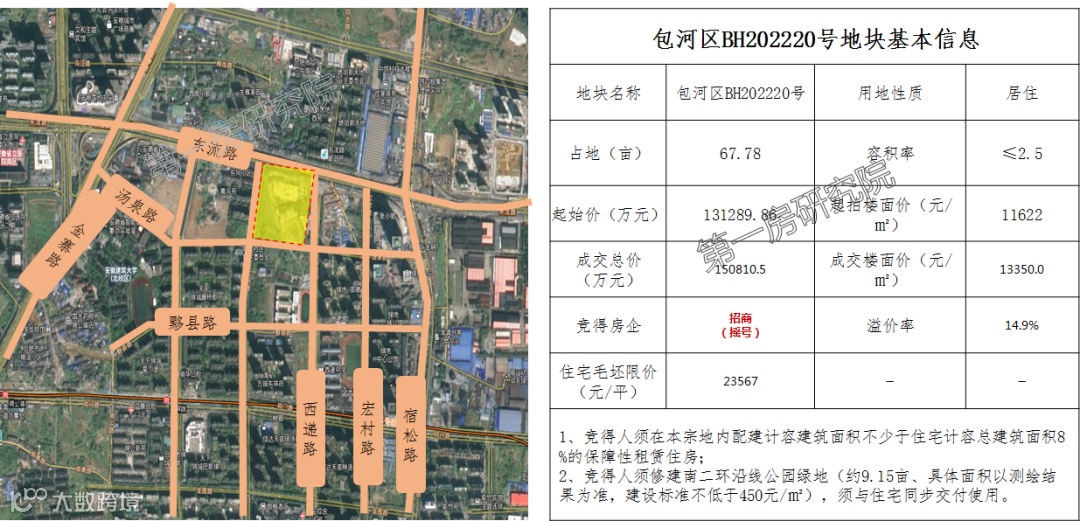 包河区BH202220号地块位于关麓路以东、南二环路以南,面积约67.78亩,纯居住用地,商品住宅(毛坯)平均备案价格23567元/㎡。竞得人须在本宗地内配建计容建筑面积不少于住宅计容总建筑面积8%的保障性租赁住房,竞得人须同步修建南二环沿线公园绿地。