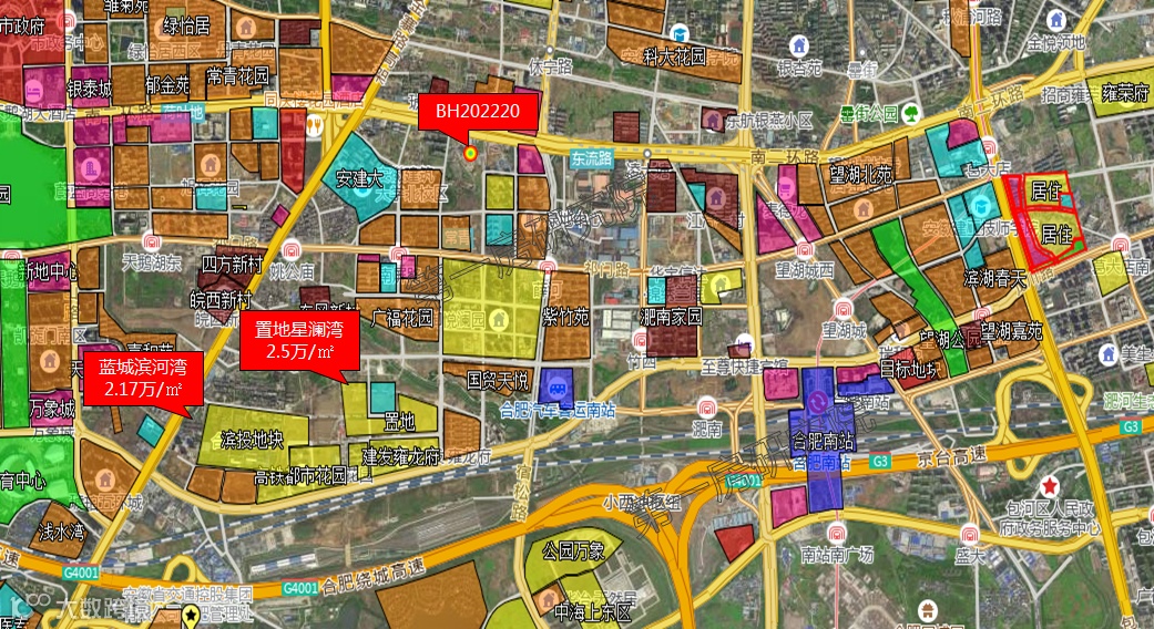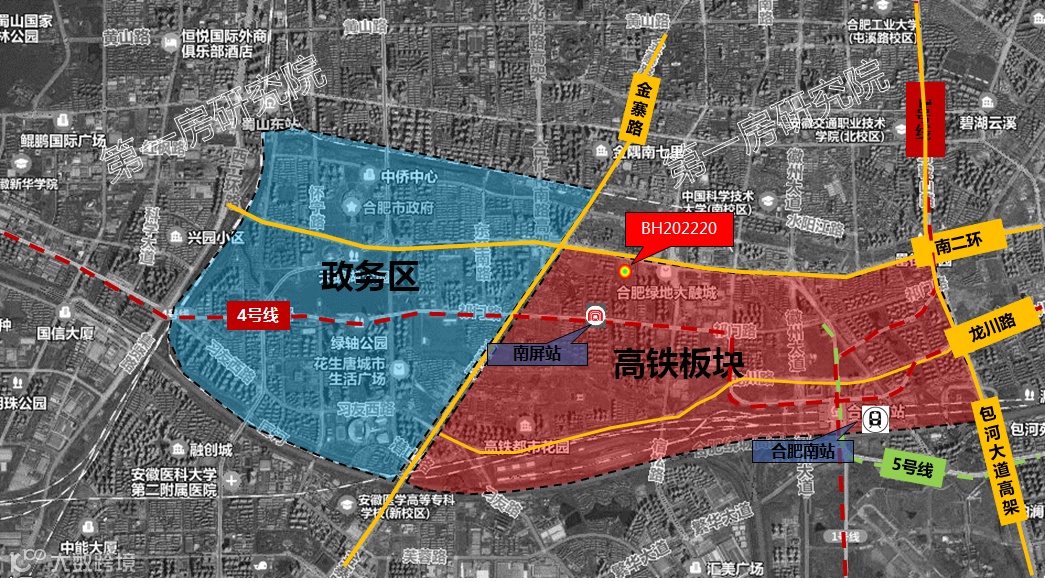 从区位上来看,地块位于政务东,包河区高铁板块。板块内1号线、4号线、5号线三条地铁线穿境而过,离地块最近的是4号线南屏站。板块内金寨路、南二环、包河大道三条高架贯穿全城,地块紧邻南二环高架,畅达全城。板块内有合肥南站,省内外出行便捷,地块交通条件十分优越。
