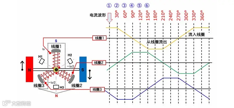 在三相线圈中,设线圈1固定在时钟的12点钟方向上,线圈2固定在时钟的4点钟方向上,线圈3固定在时钟的8点钟方向上。设2极永磁体的N极在左侧,S极在右侧,并且可以旋转。