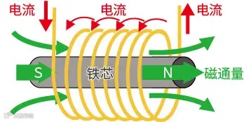 另外,将导线绕成线圈状,则磁力被合成,形成大的磁场通量(磁通量),产生N极和S极。