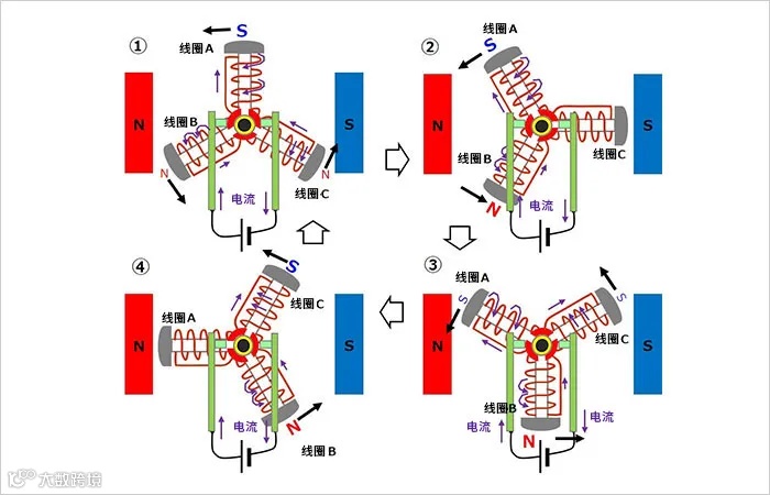 旋转中心轴的外围有三个换向器(用于电流切换的弯曲金属片)。为了避免彼此接触,换向器之间间隔120°(360°÷3枚)配置。换向器随着轴的旋转而旋转。