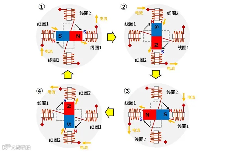下面使用下图来介绍步进电机的基本工作原理。这是上面两相双极型线圈每一相(一组线圈)的励磁示例。该图的前提是状态从①到④变化。线圈分别由线圈1和线圈2组成。另外,电流箭头表示电流流动方向。