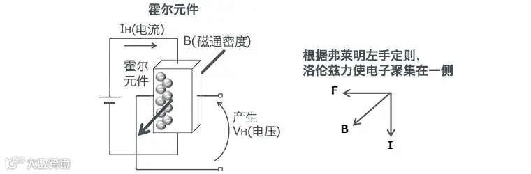 霍尔元件利用了“当电流IH流过半导体并且磁通B与电流成直角穿过时,会在垂直于电流和磁场的方向上产生电压VH”的这种现象,美国物理学家Edwin Herbert Hall(埃德温·赫伯特·霍尔)发现了这种现象并将其称为“霍尔效应”。产生的电压VH由下列公式表示。