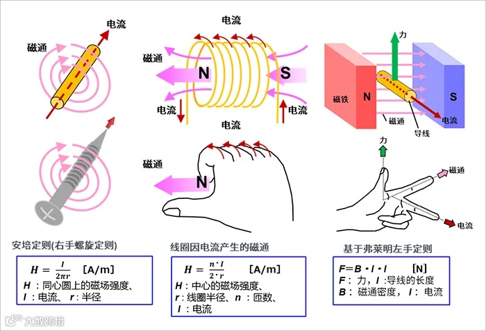首先,为了便于后续电机原理说明,我们来回顾一下有关电流、磁场和力的基本定律/法则。虽然有一种怀旧的感觉,但如果平时不常使用磁性元器件,就很容易忘记这些知识。