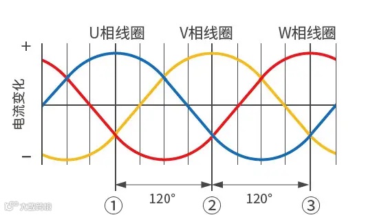 如上所述,缠绕铁芯的线圈分三相,间隔120°配置U相线圈、V相线圈、W相线圈,电压高的线圈产生N极,电压低的线圈产生S极。