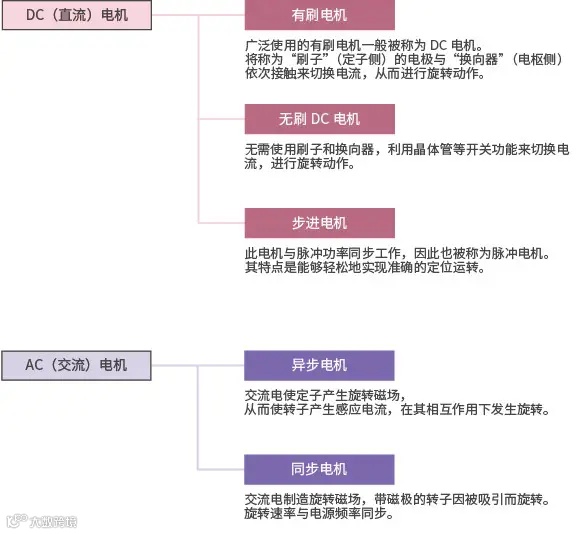 按电机驱动的电源种类,可分为DC电机和AC电机。而 根据电机旋转原理,大致可分为以下几种。(特殊电机除外)