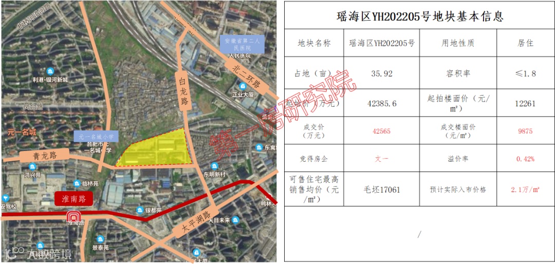 在2022年6月23日的合肥土拍大战中,瑶海区YH202205号居住用地被文一、意禾、源陆三家竞争,最终被文一以成交单价1185万元/亩竞得,该地块楼面价9874.95 元/㎡,总价42565.20 万元,溢价率0.42%,商品住宅(毛坯)平均备案价格17061 元/㎡。