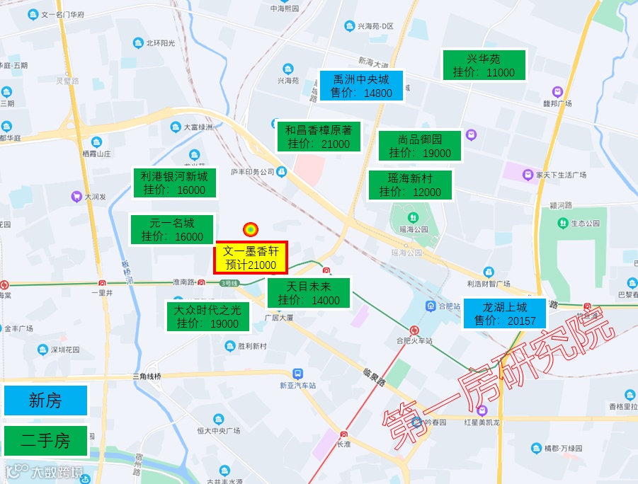 瑶海区火车站前板块新房项目仅剩龙湖上城,在售房源均价约2W,而二手房源挂价则在1.4-1.9W,因房龄及配套不同;而新站区的火车站后的七里塘板块中禹洲中央城售价约1.5W,二手房1.1-2.1W不等,因回迁房或商品房而差距较大。而本项目地块毛坯限价17061元/㎡,未来入市的精装价格预计将会超过2W。
