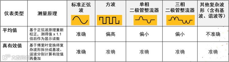 真有效值是影响钳表读数精准度很重要的原因之一,特别是现场有变频器等电气环境较复杂的工业类用户。面对不同的波形,使用平均响应和真有效值的表,会产生如图的测试结果差异。所以当测试的波形为非标准的正弦波时,选择真有效值的钳表会更加准确。