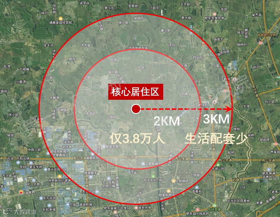 房地产发展长期看人口,肥东经开北板块三公里范围内,不仅缺乏生活配套,板块内部目前更是人烟稀薄;在板块核心居住区周边两公里,人口仅有约3.8万人左右,主要还是以经开区周边产业园的工作人口为主,原住民较少,因此板块内生需求较低,难以支撑板块长期发展。