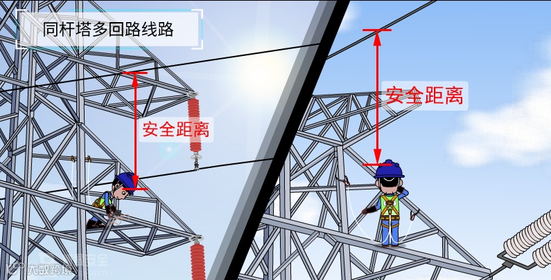 同杆塔多回线路中部分线路或直流线路中单级线路停电检修,应满足表1规定的安全距离。同杆塔架设的10kV及以下线路带电时,当满足表2规定的安全距离且采取安全措施的情况下,只能进行下层线路的登杆塔检修工作。