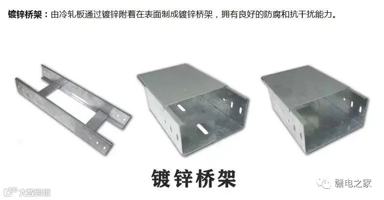 热镀锌电缆桥架:以冷轧钢板制成,表面工艺为热镀锌,由托盘式、槽体式或梯级式的直线段、弯通、三通、四通组件以及托臂(臂式支架)、吊架等组成有着密接支撑电缆的刚性结构系统之全称。